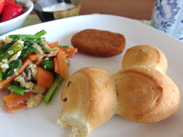 ある日の朝食では、にんじんと小松菜としめじの卵ソテー、夫がぶらぶら商店街散策の際にお惣菜屋さんで買ってきてくれたコロッケ、いちごとヨーグルト、プリンス・オブ・ウェールズのミルクティと共に。