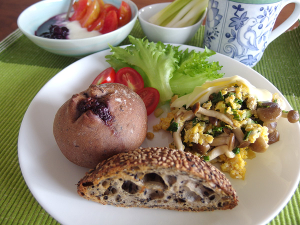 気ままに焼いたブルーベリーチョコのパンと、まちのパーラーの胡麻のパンのある日の朝食。