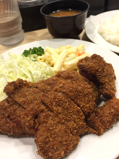 という訳で、ライスとお味噌汁がセットされて、揚げたてのビーフカツがやってきましたよ。