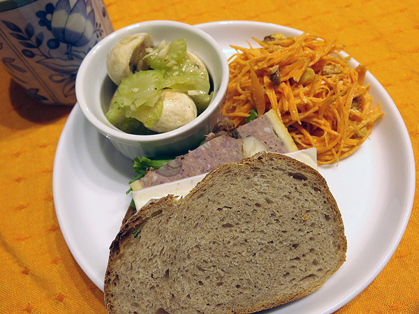 パテドカンバーニュを挟みたいねと探したのですが、木の実入りのに惹かれてしまい、周りがパイ生地で包まれているのにそれをパンで挟むという羽目に。