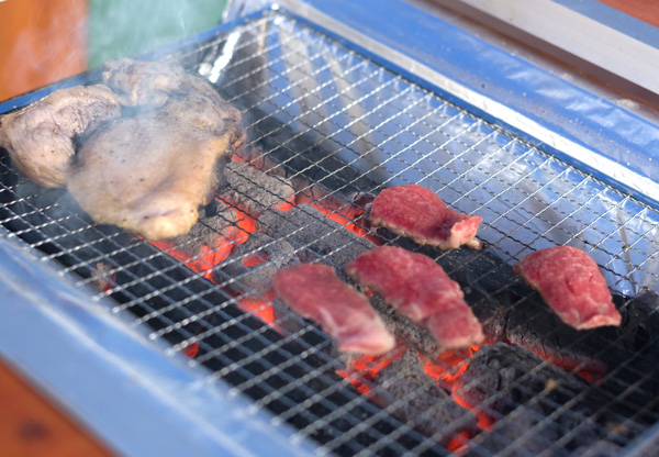 備長炭の火はすでに熾っていて、早速火の通りが悪そうな鶏もも肉から焼いてみました。