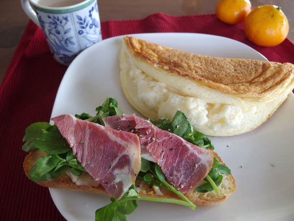 そういえば今朝は白身がたくさんあるので、泡立ててオムレツにしてみようと思い立ち、しっかりしたレシピも調べずにただ白身4個分泡立てて、黄身1.5個分くらいと混ぜて、たっぷりのバターで焼いてみました。