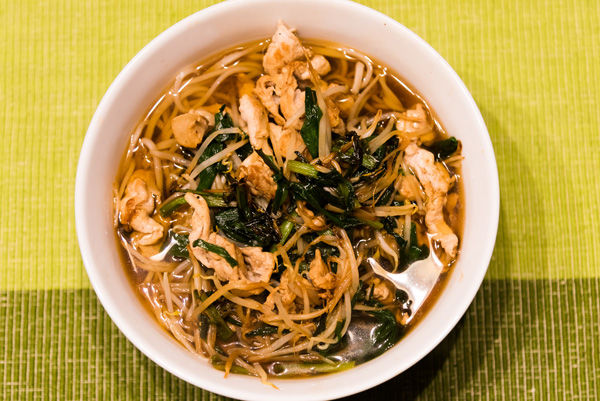 豚肉とたっぷりのニラともやしを炒めたのを熱々の日本そばのトッピングにしたものです。