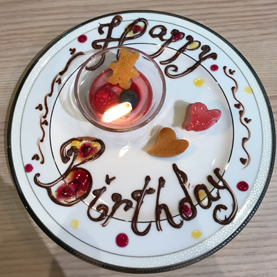 そして冒頭のバースデープレートが夫に運ばれてきたのでした。写真撮影とその場のプリントのサービスに感謝しながらも、自分のむくむくとした顔に現実を突きつけられて軽くショックを受けつつ、全体的にとても居心地の良いサービスと美味しいお料理に大満足でした。夫にも「どれも美味しい」と喜んで貰えてうれしい限り。
