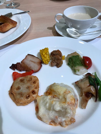 手前のお皿、ラザニアとか白身魚のポワレとか、色々。レンコンのはさみ揚げは揚げ油が共有されているとのことでしたが、貝類を挙げてなさそうなので(甲殻類は深刻ではないため)あまりに美味しそうで一つだけいただくことに、淡路島の藻塩をかけると最高です。
