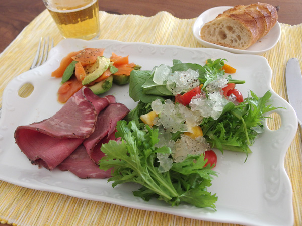 アボカドとスモークサーモンのサラダ、ローストビーフ、ワサビ菜と金柑のレモンジュレサラダ。ローストビーフで金柑やワサビ菜を巻いて食べます。レモンジュレもちゃんと作っていて、すごいなあと思いました。どれも美味しい。