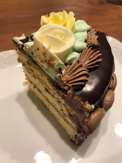 途中休み休みで3時間くらいかけてゆっくりとしたおいしいディナーを堪能した後は、私のリクエストでアルプス洋菓子店のバターケーキ。