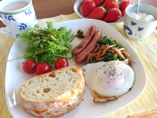 ソーセージには粒マスタード。目玉焼き。プチトマトは毎日食べています。いちごは、あまおうが最近は多いです。自家製ヨーグルトに、ハーブミルクティ。