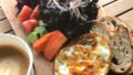 カットされていたものを縦半分にしてそれを一人分とし、さらにクラムに切れ目を入れて、粒マスタードやツナ、パセリを乗せて、チーズをかけてオーブンで焼いています。