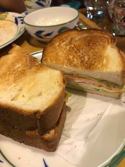 トーストされた分厚いイギリスパンでレタスやハムなどがサンドされていて、いわゆるクラブハウス的な感じというよりはトーストサンドって感じですが、これはこれで美味しかったです。