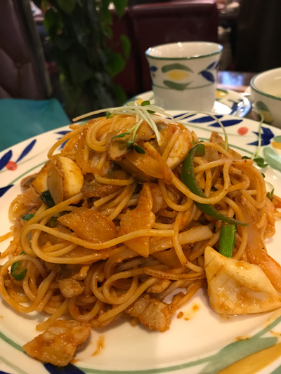 こちらが夫のオーダーの懐かしのナポリタン、いかとかいろいろ入ってて焼きそばっぽさもあります。