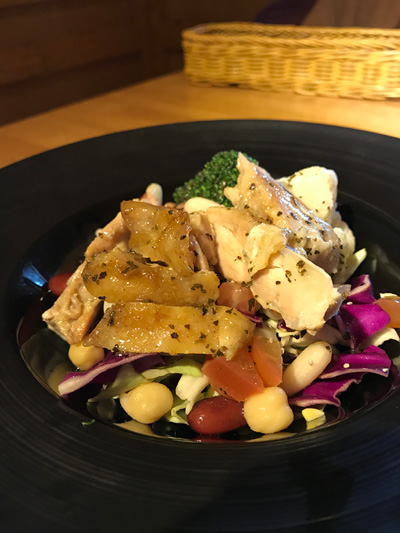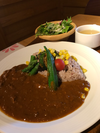 ランチにはやや混み始めたカフェで私は野菜カレーと、シェアするチョップドサラダなどを。夫はビールセットとかフライものとか、あとワインバーであれこれと冷えたワインを飲んでいました。ちなみにコーヒーはお水と一緒に飲み放題のマシンがカフェの外に置かれています。