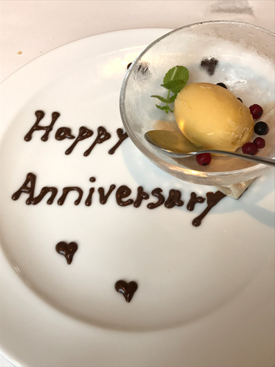 折角なのでアニバーサリー仕様にしていただきました。自分でオーダーしておきながら、いつもこういうのは運ばれる瞬間は照れるものです。