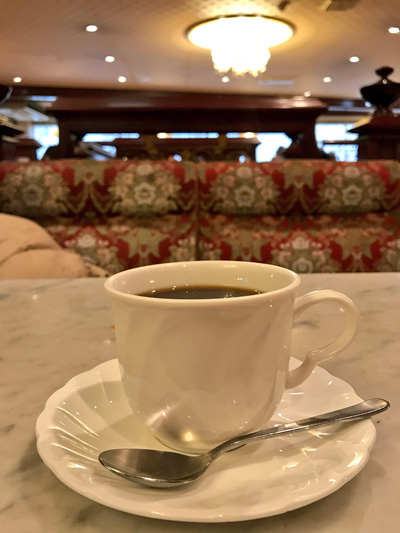 入ってみるとそのフロアの広さに一瞬圧倒されてしまい、お店の人の誘導に従おうと思いましたがにこやかに「お好きなお席へどうぞ」と言われ、さらに戸惑いました。なんせ、一人で座る前提ではあまりなく、広々とした4人用の席がひたすら配置されています。ならば選ぶ基準として、煙草の影響が今少なさそうな場所をと考え、さらにお店を見渡せる方に着席しました。窓際は一段高くなっていることも判りましたし、シャンデリアの豪華さにも昭和の良き日を思い出させます。