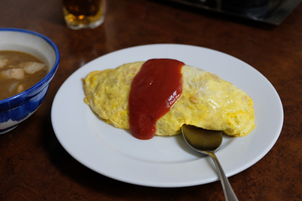 私はオムライス750円。昔ながらの薄焼き卵にケチャップが乗っています。