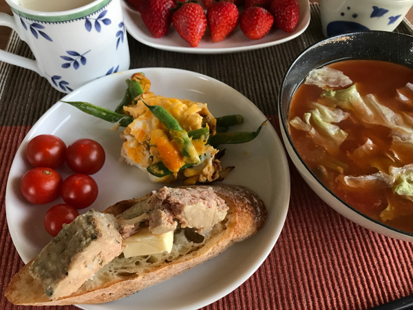ル・プチメックで山椒バゲットを購入した先月のとある日、偶然にも夫がパテ・ド・カンパーニュを買ってきていて、これはこの二つを合わせた朝食を作るしかない嬉しい状況に。