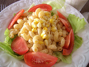 たっぷりレタスの上に、パスタを乗せて、トマトを添えて出来上がり。