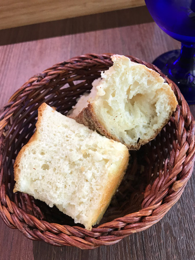 ランチには、まずオリーブオイルを添えた自家製パンが付きます。カンパーニュとフォカッチャと見ました。