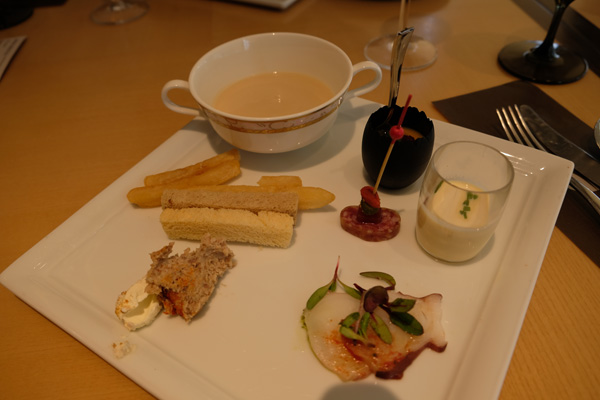 エビのお料理を避けてるとちょっと寂しい形になりましたが、豚のリエットやカリフラワーのポタージュとかタコのマリネとか安納芋のスープ(グラスの方)とかそれぞれに美味しく、さらにワクワクしておりました。