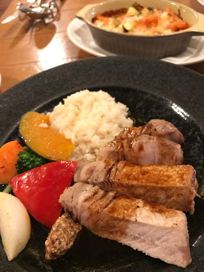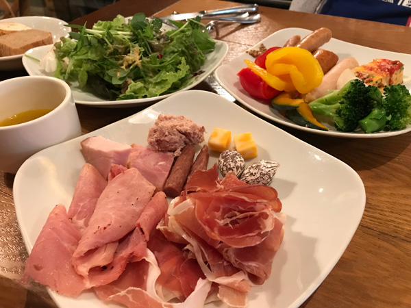 サーモンやズッキーニのマカロニグラタン1650円と熟成肉のランチで豚ロース1950円をシェアしました。どちらも生ハムをはじめサラダやスープ、ソフトドリンクなどのビュッフェがついていて、大変美味しくコストパフォーマンスが高いランチでした。