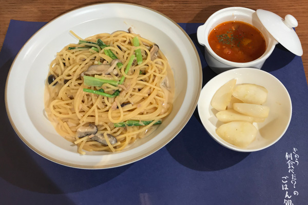 夫には、きのことツナとカブの葉の和風パスタ/ミネストローネ/カブのサラダ わさびドレッシング¥1,290。