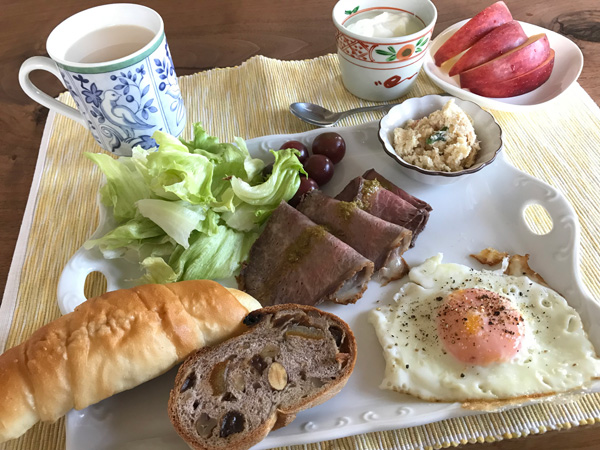 そういった品々を、いつものイングリッシュブレックファストのミルクティや自家製ヨーグルト、レタスとプチトマトのサラダ、目玉焼き、りんごで迎え入れいます。