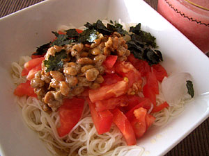 トマトのざく切りと、納豆を合わせ、海苔を散らして。