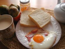 お供はベーコンエッグとミルクティ、そしてソルダムです。