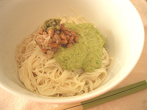 茹でてきゅっと水で洗ってしめたそうめんの上に