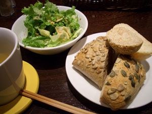 スープ、サラダ、自家製パンもしくはパン(どちらも食べ放題!)がつき、