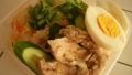 蒸し鶏は自然解凍。薄焼き卵を作って短冊に刻み、皿に盛るけど今ひとつ何か足りない。
