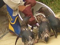 きゃーきゃーきゃー(群がりあぐあぐと鰯を丸呑みするフェアリーペンギン)