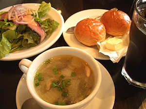 彼はタイ風ローストビーフ入りサラダ、私はキノコ入り中華スープ、パン。