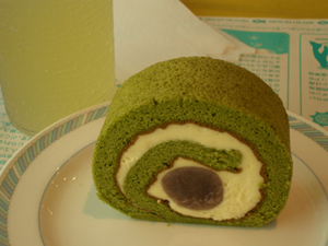 彼は抹茶ロールケーキセット、レモンスカッシュで。