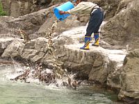 彼らは殆どは人間が見ていると本当は怖くてあまり食べられないので、この後岩場の影で改めてお姉さんにえさを貰っていました。