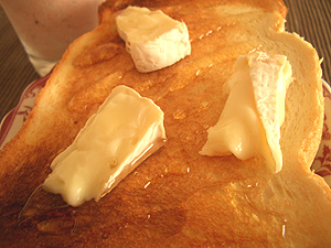 シンプルなパンドミにをこんがりとトーストし、カマンベールチーズを無造作に切って乗せ、はちみつをかけます。