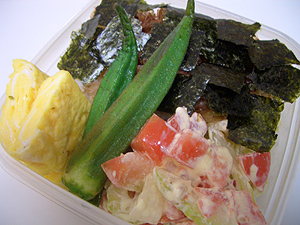 サラダはセロリとトマトとミョウガをすり胡麻入りのマヨネーズで和えてます。