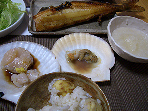今朝届いたばかりのホタテとほっけの一部を晩ごはんに。
