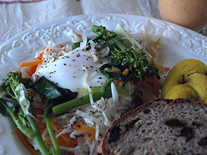 今回は、いつものキャベツだけの巣篭もり卵を野菜具沢山で作ってみました。