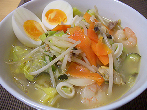 野菜は、にんじん、きゃべつ、もやし、なす、ピーマンを入れました。
