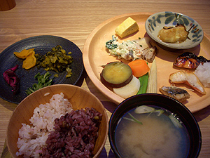 上記の前菜の次に、根菜類中心のお惣菜を頂き、このようなご飯セットを作り。