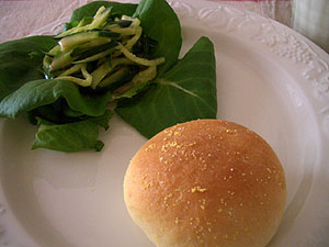 サラダ菜の上には、ゴマドレッシングで和えた千切りきゅうりです。