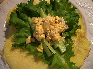 グリーンリーフ、きゅうり、ゴマドレッシングをかけた卵サラダを 中に乗せ、