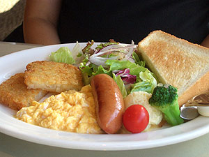 配偶者は、スクランブルエッグとトーストとソーセージのこちら。