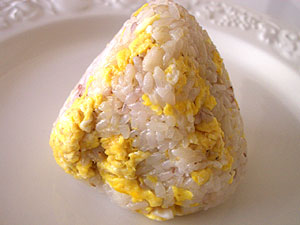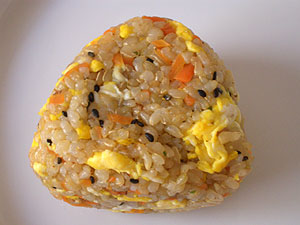 冒頭は、炒り卵を雑穀米のごはんで握ったものです。