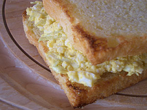 前述のイギリスパンは、軽くトーストし、ゆで卵をつぶして卵サンドに。