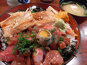 マグロのづけと、ふっくら穴子が直径25cmくらいの器表面を覆っていて