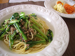 塩そぼろと小松菜のペペロンチーノ