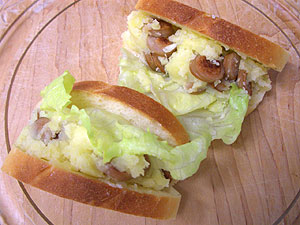 ミルクフランスパンでは、ソーセージ入りのポテトサラダとレタスを。