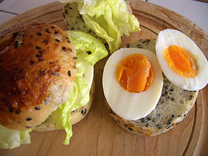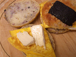 冒頭はもろみ醤油風味の雑穀米ブレッドで、野菜のオムレツとレタスをサンド。